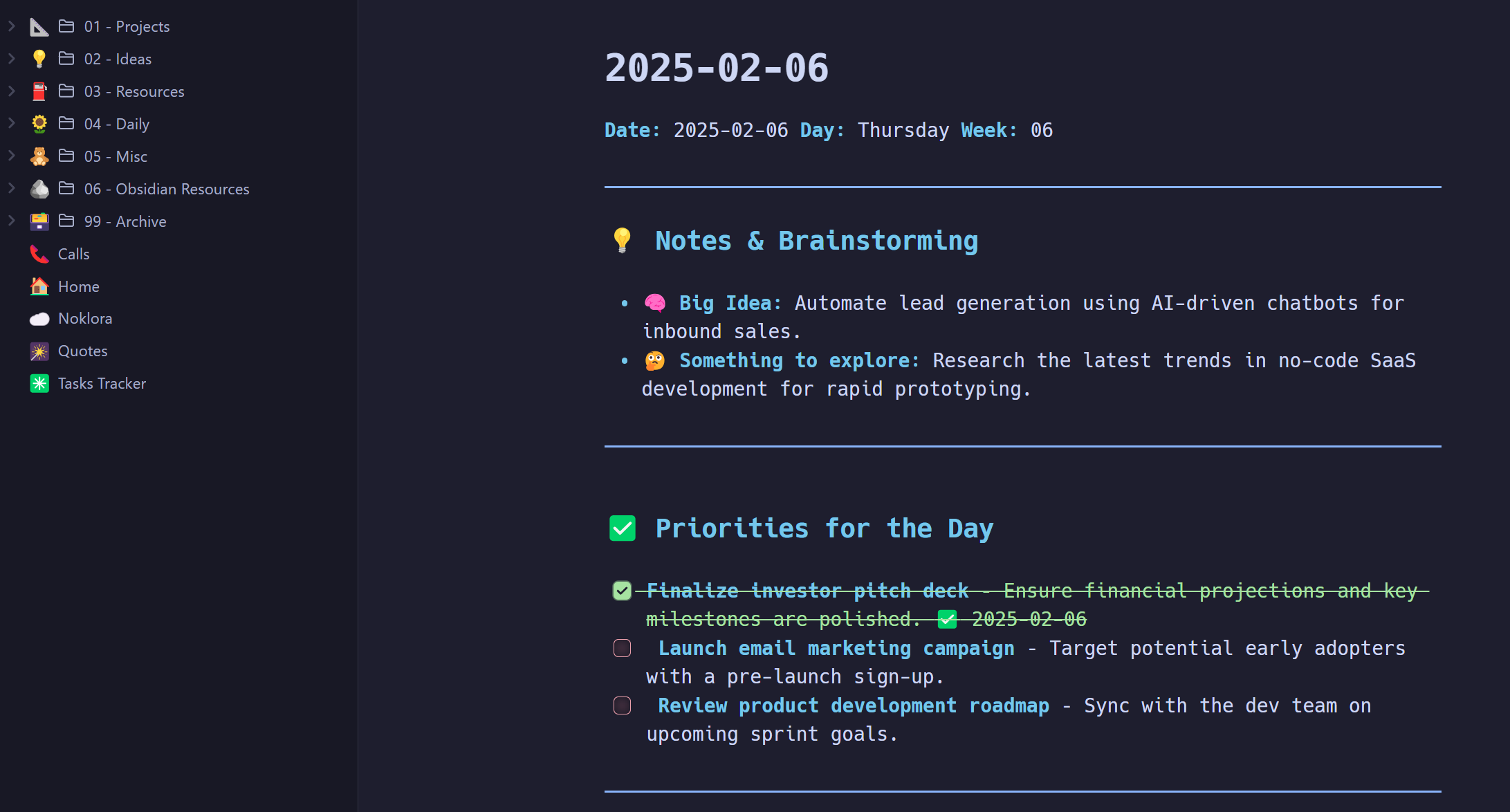 Running a business means managing tasks, meetings, and key decisions—staying organized is the difference between growth and chaos. That’s why real CEOs, founders, and executives rely on the Business Daily Note Taker for Obsidian—a battle-tested system, used daily to structure workflows, capture insights, and stay ahead.